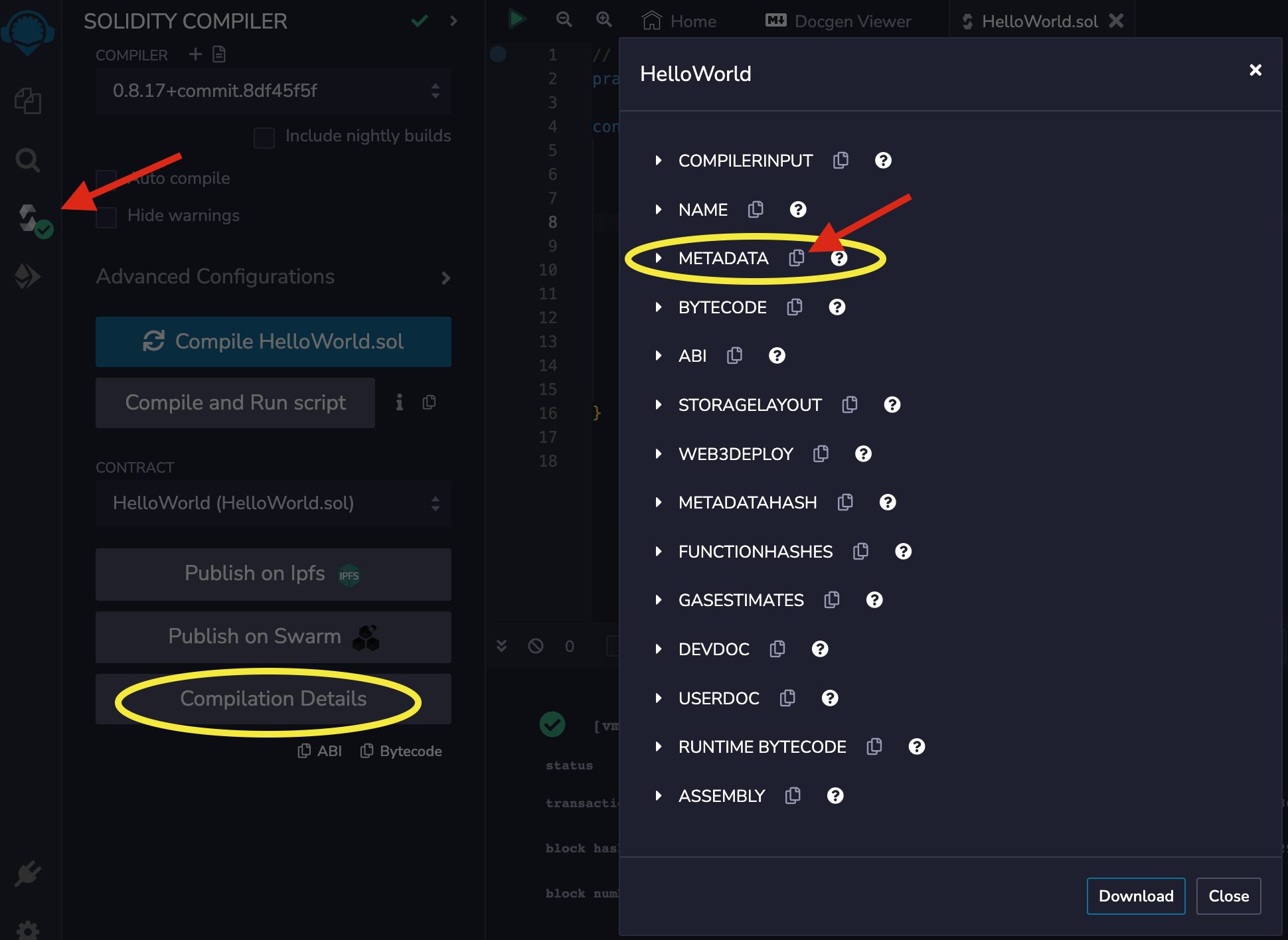 --metadata flag to the Solidity command line compiler to get the metadata output printed.solc vs. solcjs📣 solcjs will not generate the metadata using the --metadata flag. The option is only supported in solc.HelloWorld smart contract: