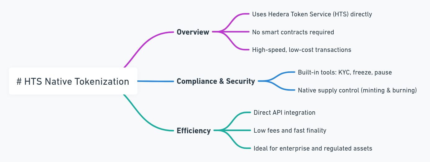 | Feature | HTS Native Tokenization | ERC/EVM Tokenization | Hybrid Tokenization |
