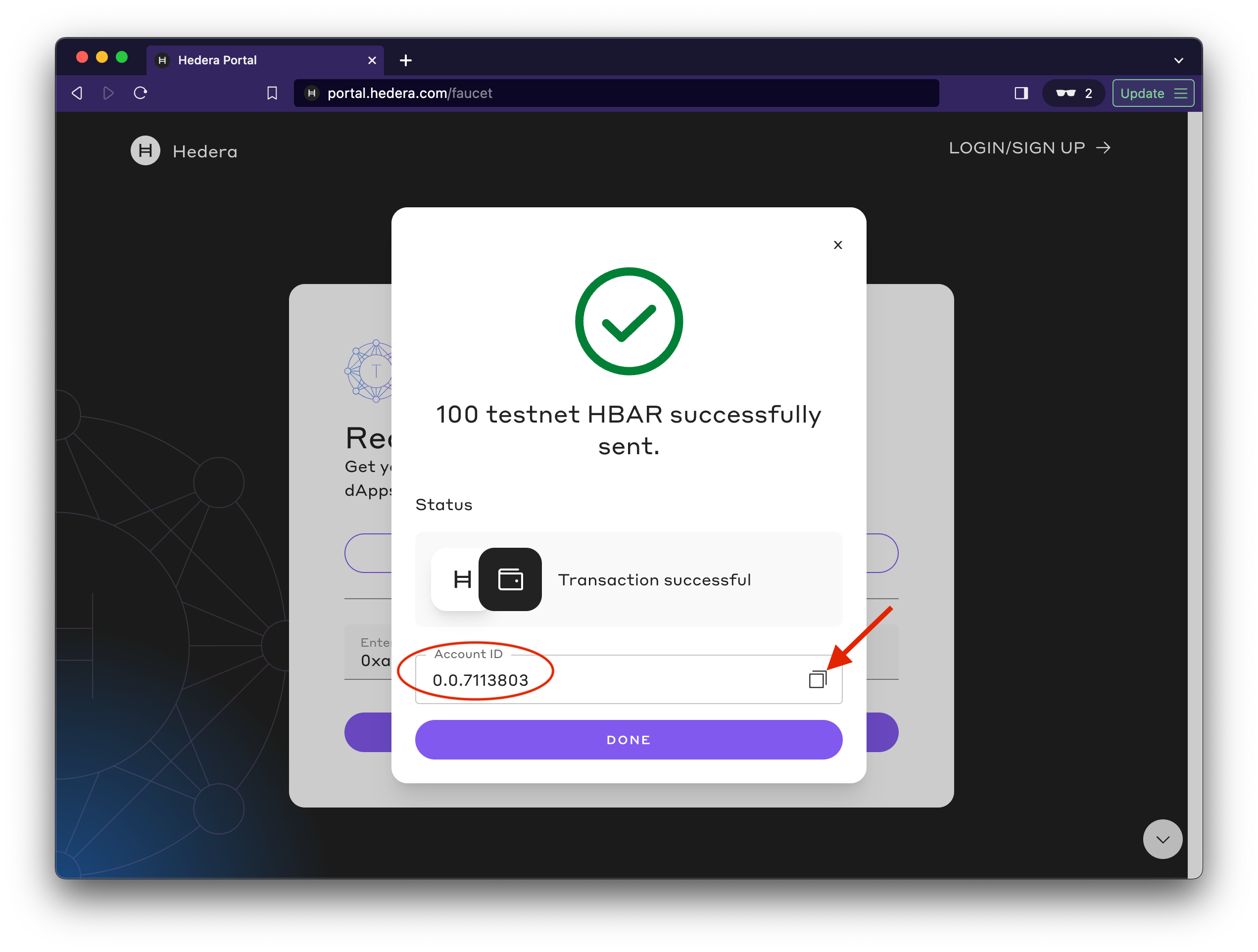 - Click the RECEIVE 100 TESTNET HBAR button to initiate an auto account creation flow that creates and funds a new testnet account