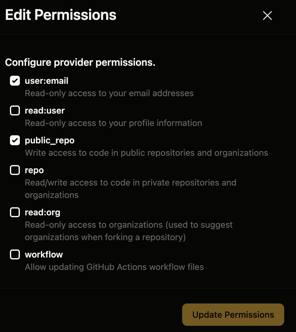Enablepublic_repo permission for GitHub provider on Gitpod’s Git integrations page.