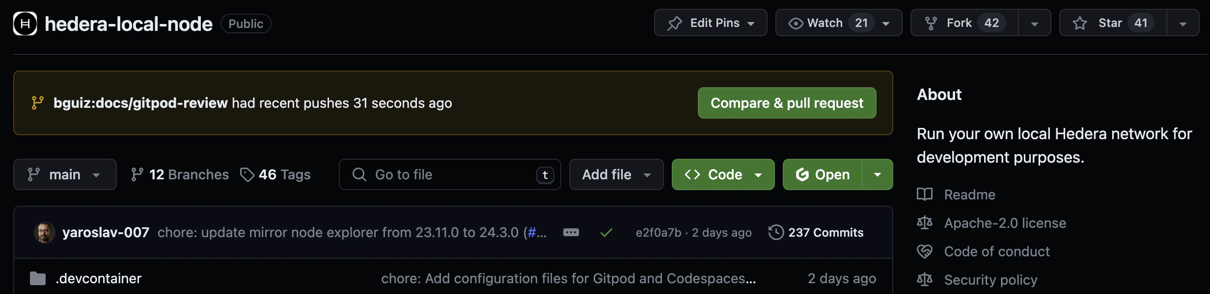 Thehedera-local-node project repository already has a Gitpod configuration file (.gitpod.yml), which makes it easy to run it within a workspace on Gitpod. Open the Hedera Local Node repo. Click on the Gitpod Open button.