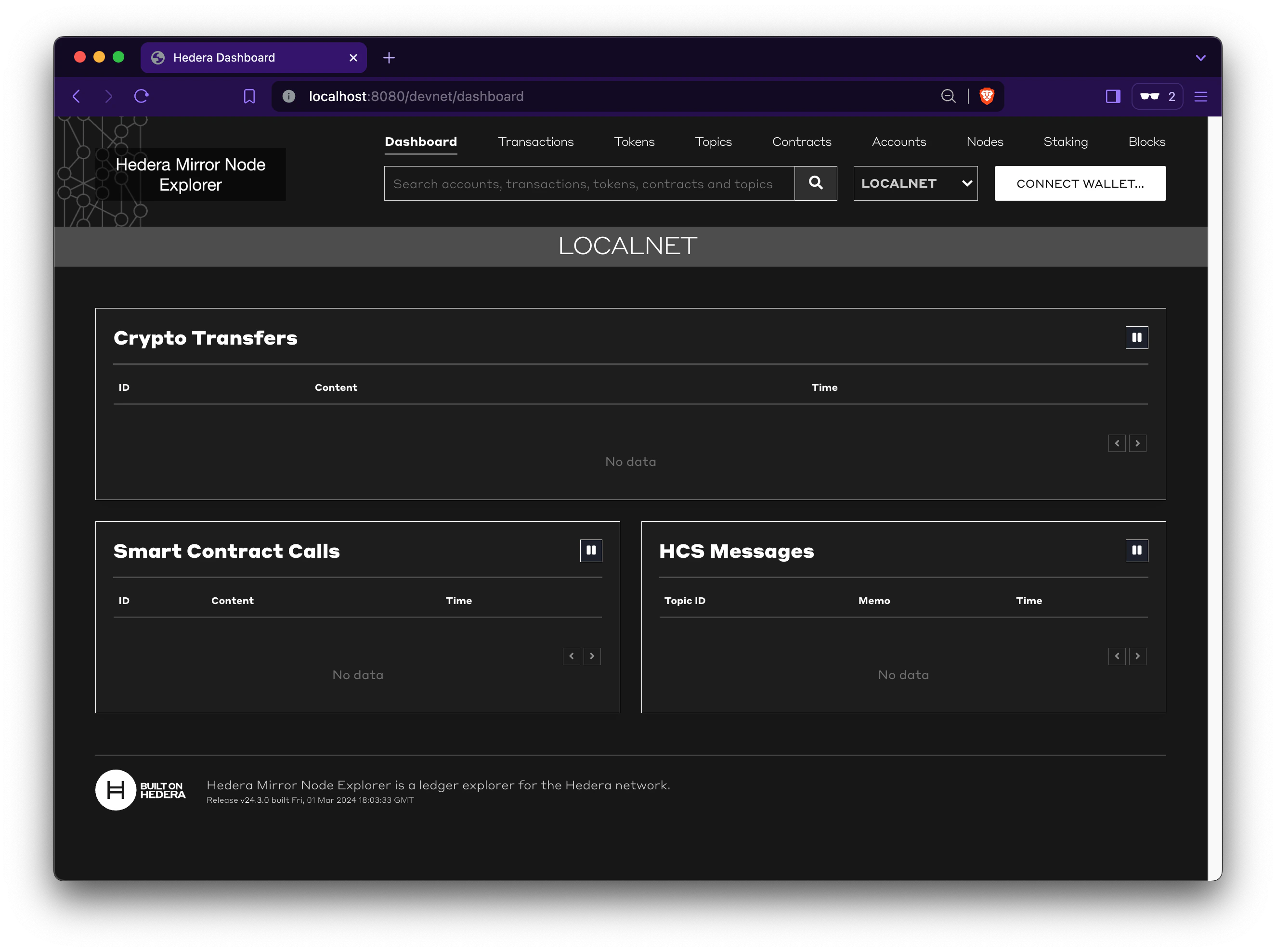Visit the local mirror node explorer endpoint (http://localhost:8080/devnet/dashboard) in your web browser. Ensure that LOCALNET is selected, as this will show you the Hedera network running within your Gitpod, and not one of the public nodes.