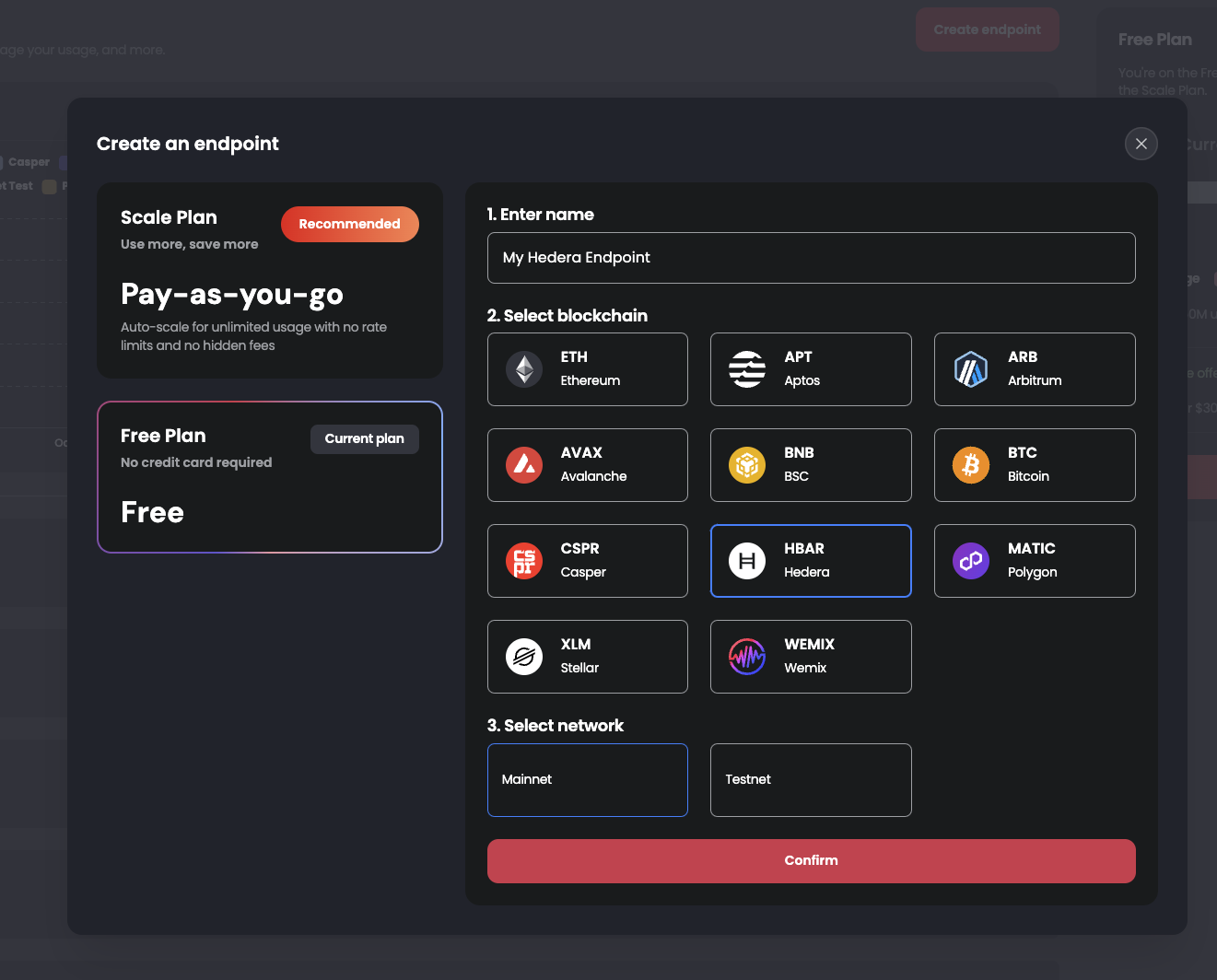 - (4) Fill in a name for the endpoint, select Hedera and pick whether you want Testnet or Mainnet, then click on the “Confirm” button: